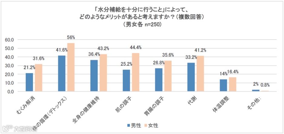 “充分补充水分”你认为有哪些好处呢?就这个问题来说,区分男女性别看,女性在所有项目上的占比都较高。作为补水的好处,“改善身体循环”和“维持健康”在男女中都比例较高,而女性在“改善肌肤状况”这一项上占比特别高,这也是其特点。