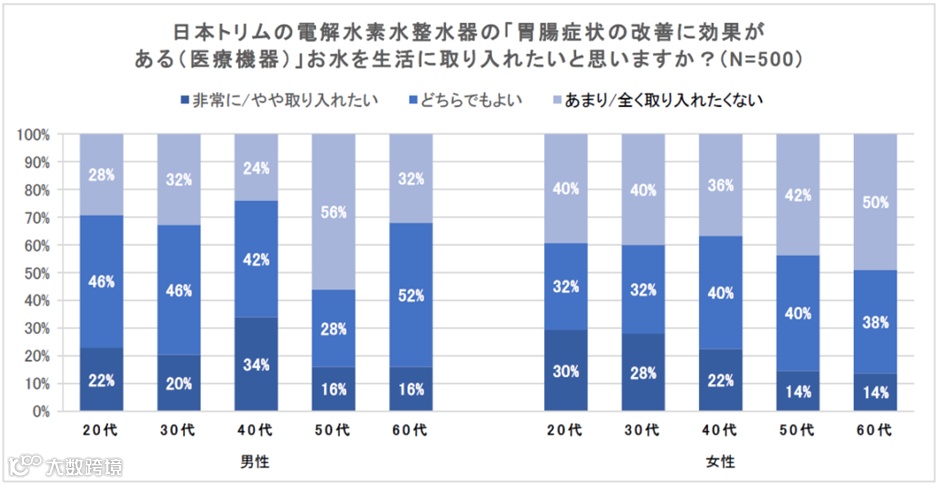 但是,在知晓了“家庭饮用水制水产品中有些是具有‘改善胃肠症状效果的管理医疗器械’”这一事实后,被问到有没有购买意向时,40多岁的男性有34.0%、20多岁的女性有30.0%表示出“想买”的积极反应。