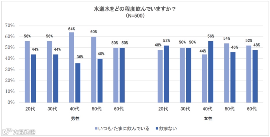 按属性来看,在年轻人和中年人群中,女性不喝自来水的比例高于男性,呈现出可说是“远离自来水”的倾向。回答“不喝”的比例在40多岁女性中达到56.0%,超过半数,是所有属性中最高的。此外,在20至30岁的年轻人群中,20岁和30岁男性中有44.0%,20岁女性中有52.0%,30多岁女性中有50.0%的人表示“不喝”。
