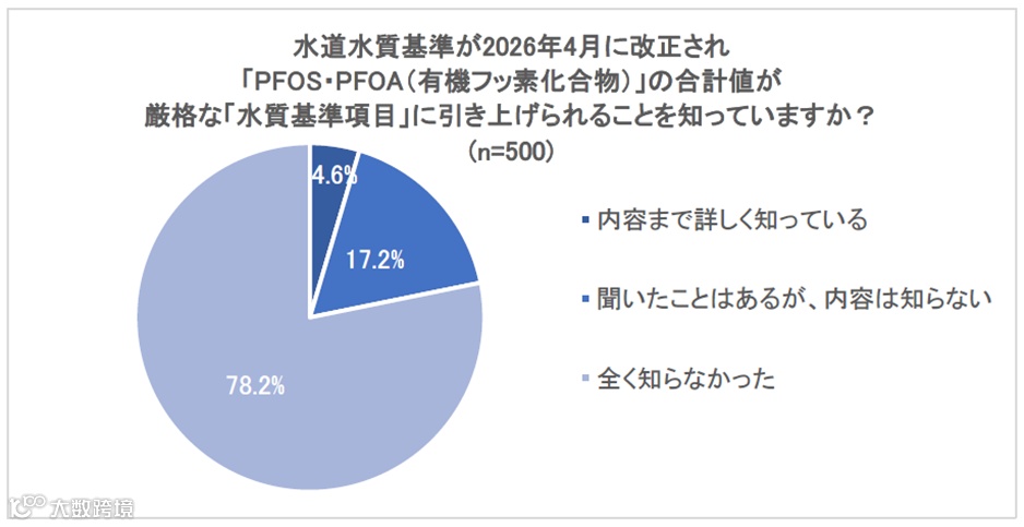 在这次修订前,我们对全国20至60岁的500名男女进行了在线问卷调查,在问到“您是否知道自2026年4月起自来水水质标准将进行修订,PFOS和PFOA的总值标准将变得更加严格?”时,仅有4.6%的人回答“了解详细内容”。