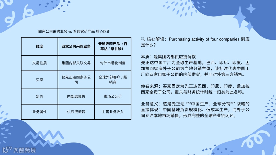 产品端覆盖杀虫剂、杀菌剂、除草剂全品类,高价值产品与基础走量产品搭配,而其中数据中频繁出现的Purchasing activity of four companies,并非具体农药产品,而是先正达的集团内部关联交易标注,这是理解其业务的关键。