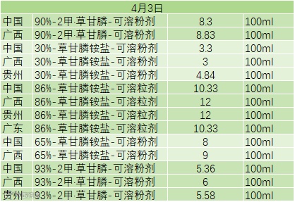 📅 4 月 3 日草甘膦类农药零售价(100ml 规格)
