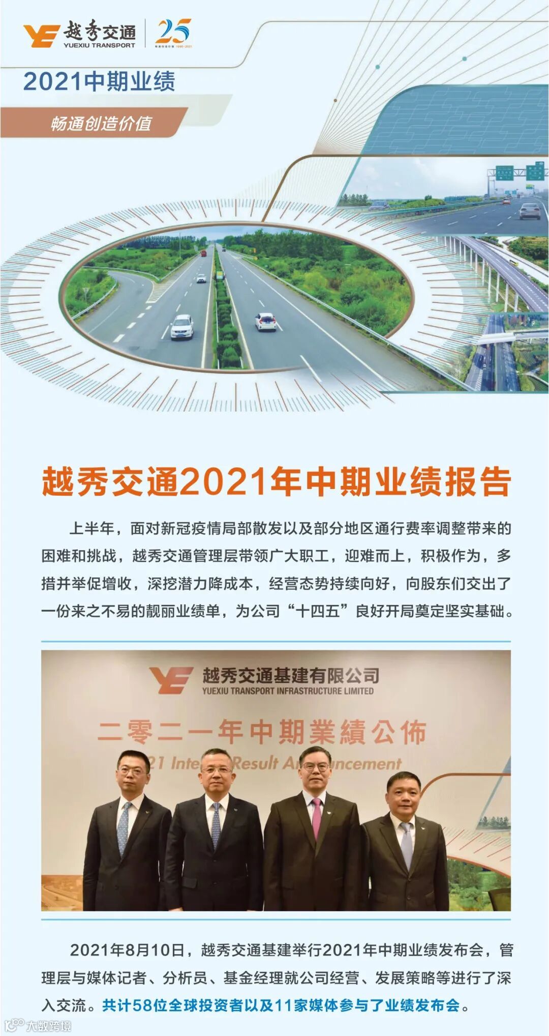 导读:2021年8月10日,越秀交通基建举行2021年中期业绩发布会,管理层与媒体记者、分析员、基金经理就公司经营、发展策略等进行了深入交流。共计58位全球投资者以及11家媒体参与了业绩发布会。