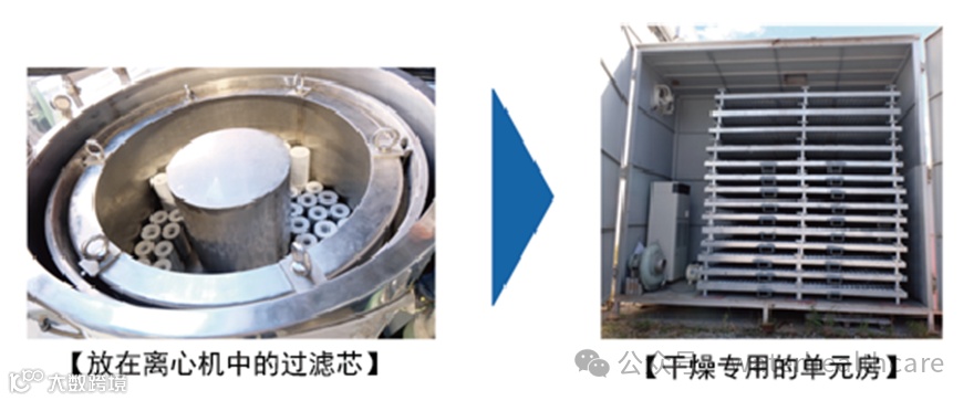 过滤芯中残留着水分,因此要用离心机甩干。然后,为了彻底去除掉水分,还要把它们静置放在干燥专用的单元房内2~3天。