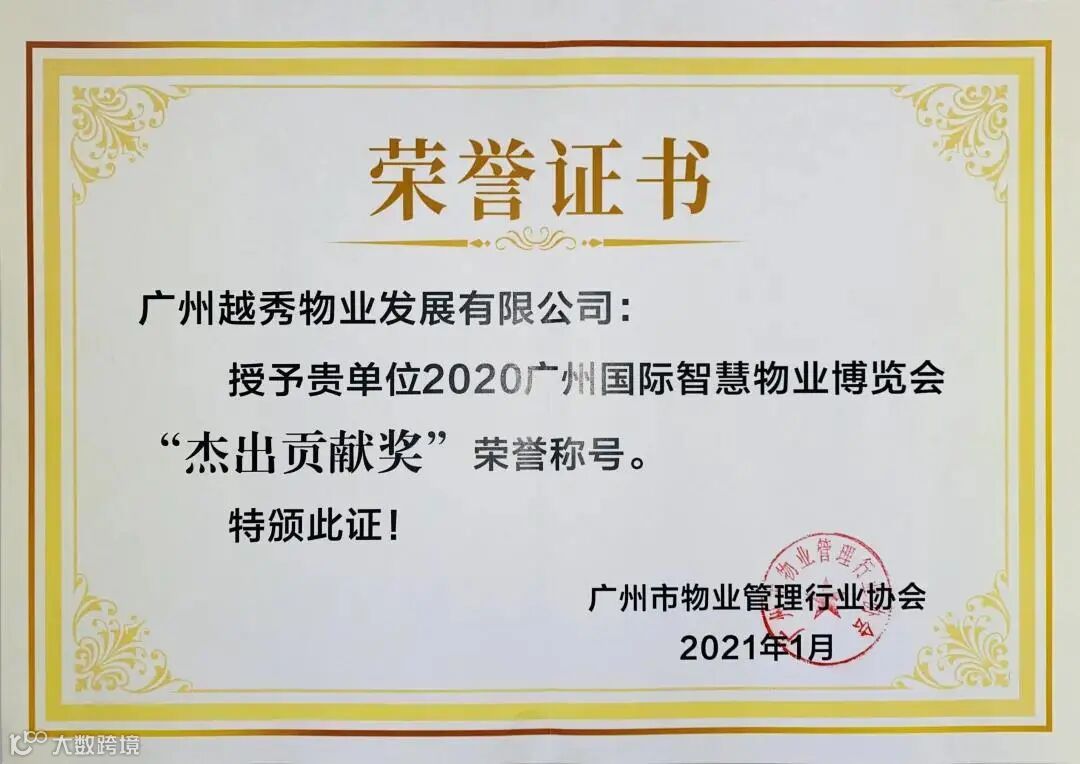 ▲“2020年广州国际智慧物业博览会杰出贡献奖”荣誉证书