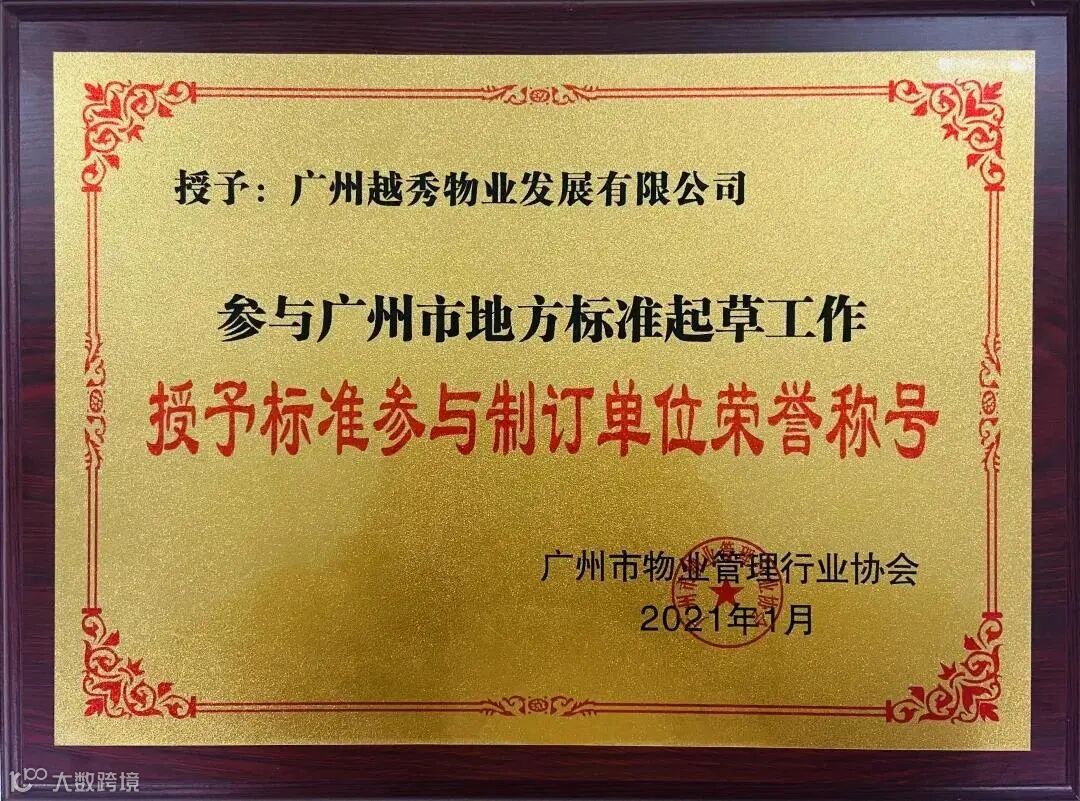 同时,越秀物业因积极参与广州市地方标准《物业服务第2部分:住宅小区》起草工作,为促进物业服务规范化、标准化发展做出了重要贡献,被大会授予“标准参与制定单位”荣誉称号。