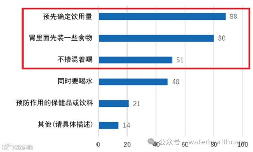 在调查※1中,当问及如何防止宿醉时最常见的答案是“预先确定喝酒的限量”、“提前吃点东西垫肚子”,其次是“不要混着喝”、“喝酒时一起喝水”。