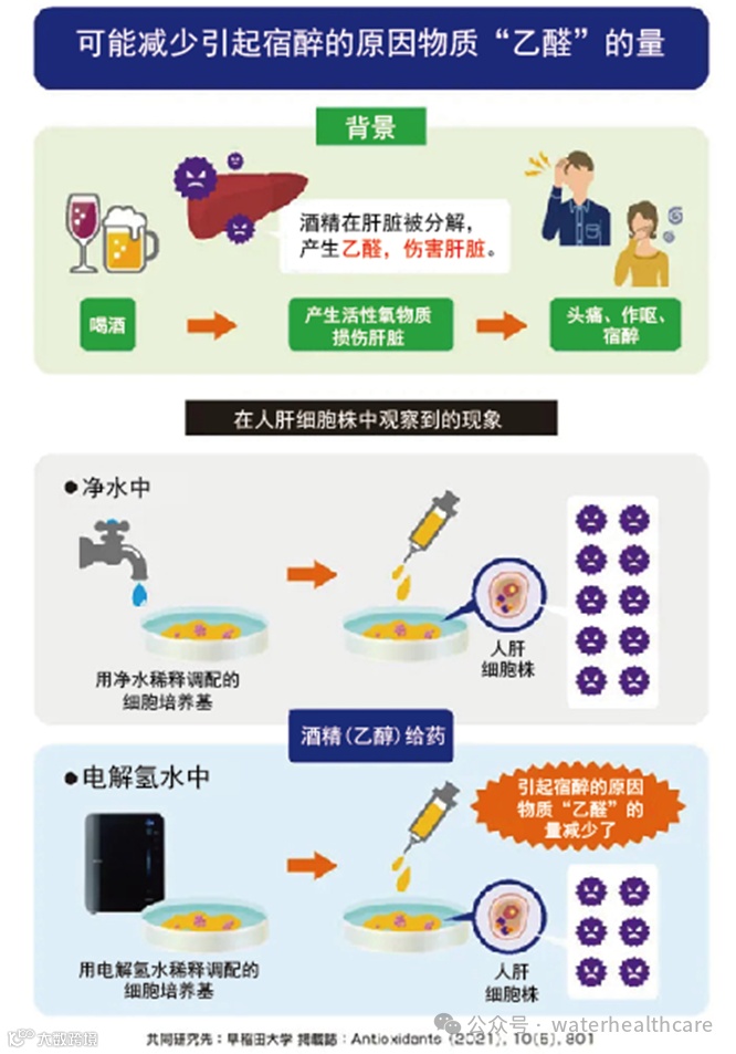 株式会社日本多宁与早稻田大学的联合研究,报告了电解氢水通过作用于酒精和乙醛的代谢酶,减少酒精产生的有毒物质乙醛的细胞内含量,从而并发挥细胞保护作用的机制。