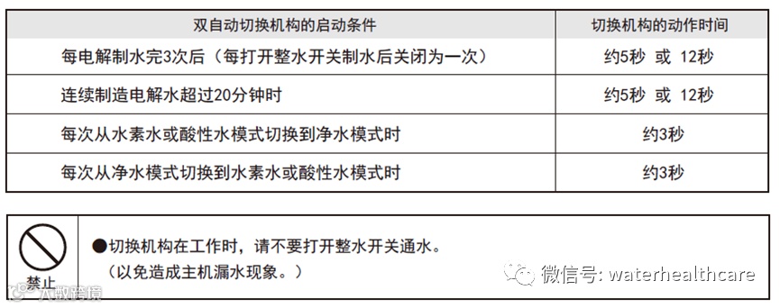 “定期同时变换电极板正负极性和酸碱水路”的多宁自创技术称为“双自动切换制水方式”,使每块电极板都能定期作为正极或负极使用,由此均摊了工作负荷,有效抑制了正负极长期不变的情况下水中矿物质成分积聚沉着在负极表面形成水垢、以及正极侧电极板寿命短的弊端,从而确保了电解效果,延长了电极板使用寿命。