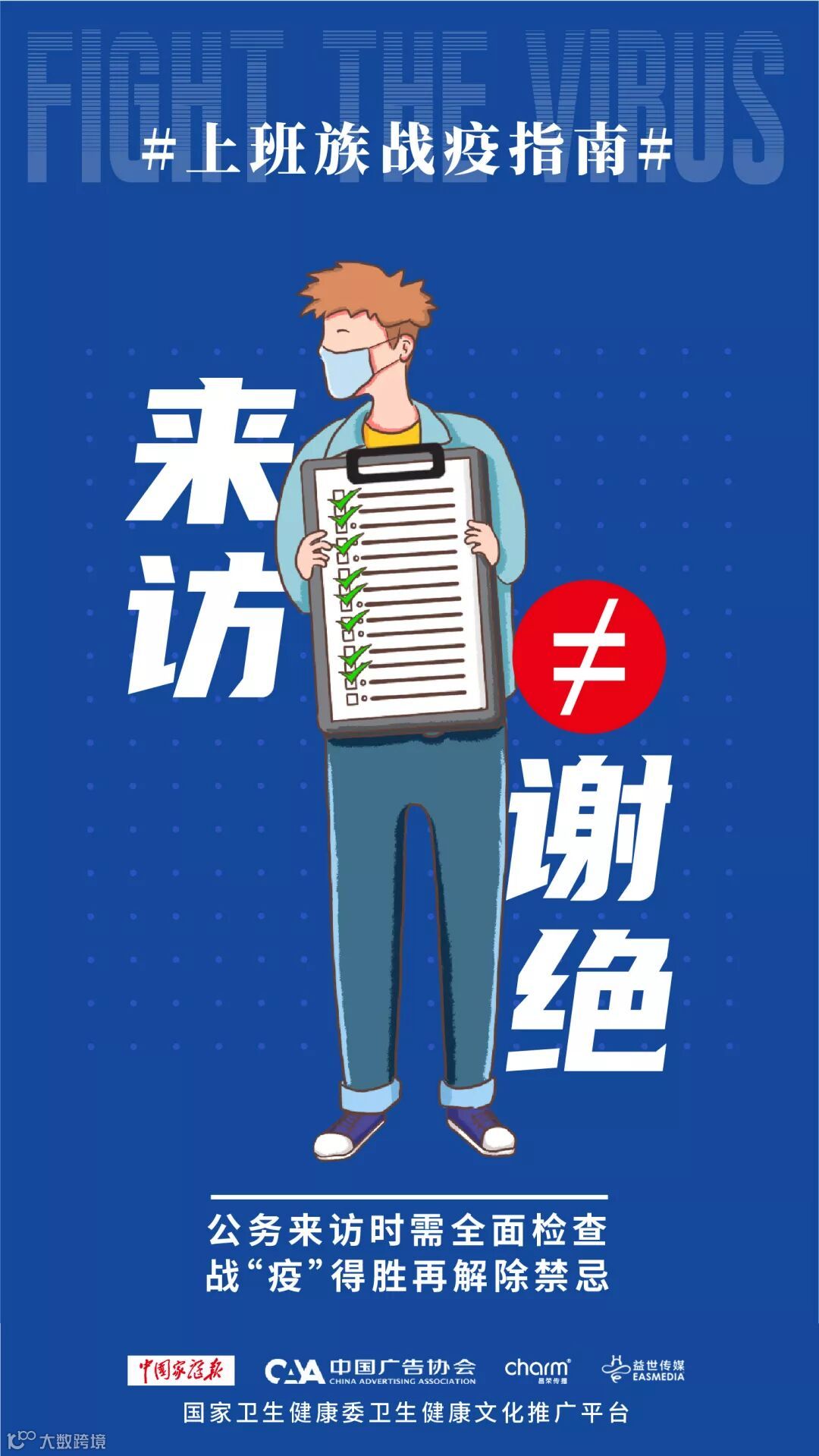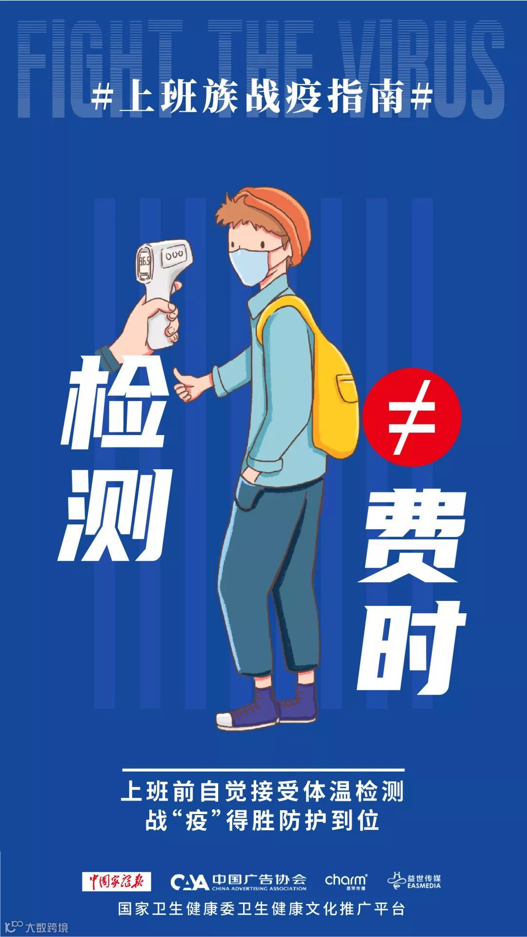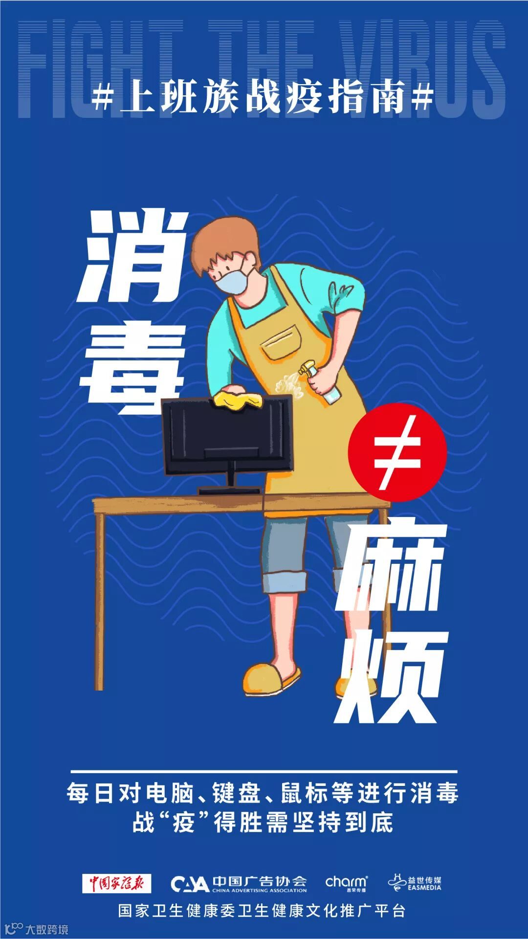 为扎实有效开展新型冠状病毒感染肺炎疫情防控工作,确保各行业员工生命安全和身体健康,保障疫情防控期间办公平稳有序,国家卫生健康委卫生健康文化推广平台、中国家庭报、中国广告协会联合益世传媒等广告界同仁共同对外发布了#上班族战疫指南#。