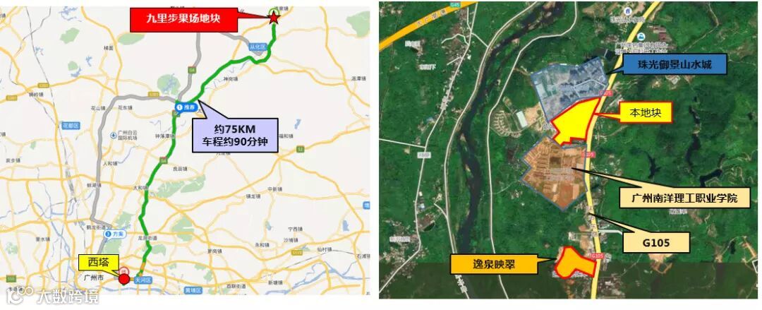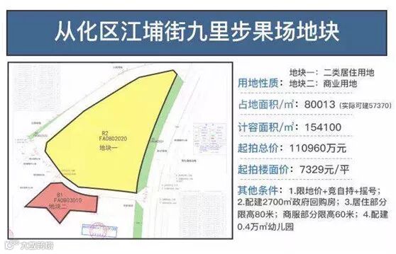 从化江埔街九里步果场地块为二类居住用地、商业用地,占地面积80012.79平,计容建面154099.78平,挂牌起始价110960万元。