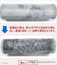 滤芯内胆(活性炭)(下面那根是假冒品,几个月后就出现脱碳,堵塞水机造成故障。)