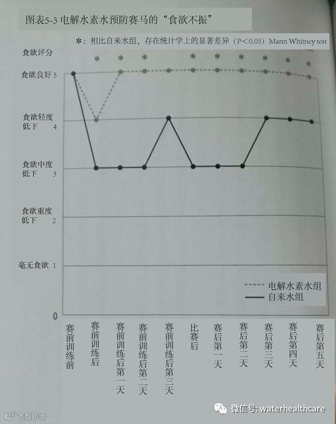 这次实验的测试对象全都是大井赛马场的现役赛马,共16匹,其中的9匹喝了1个月的电解水素水,剩下的7匹喝自来水。并且,在正式比赛3天前的最后一次赛前训练后以及正式比赛前后,对牠们的食欲状况进行了评分(图表5-3)。