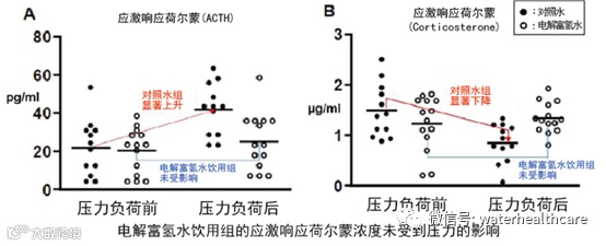 研究中把实验用大鼠分为电解富氢水饮用组或对照水组,让其自由饮用一周。之后,在装有2.2cm高的水的量器里放置5天,诱导产生慢性应激。这5天,实施自由饮水和一定量的强制饮水。最后对比研究了持续性压力前后大鼠的血中氧化应激标志物、抗氧化应激标志物、炎性标志物、应激响应荷尔蒙浓度的变化。