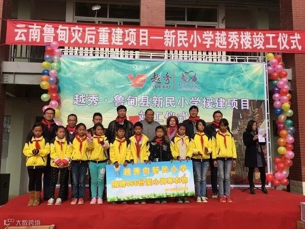 龙头山镇新民小学在地震中受损严重,共有1744平方米教学建筑经有关部门鉴定为严重受损建筑,不能使用,需要原址重建。地震后第三个月,越秀集团便深入灾区实地考察,在了解到新民小学的具体情况和需求后,经过进一步的仔细考察和评估,决定与当地教育部门及中国扶贫基金会共同合作援建新民小学B栋教学楼,并命名为“越秀楼”。