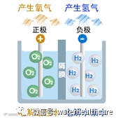 通常被称为“电解”,对由氢氧组成的水中施放电能时,在正极一侧生成含氧气的酸性水,在负极一侧生成含氢气的碱性水。