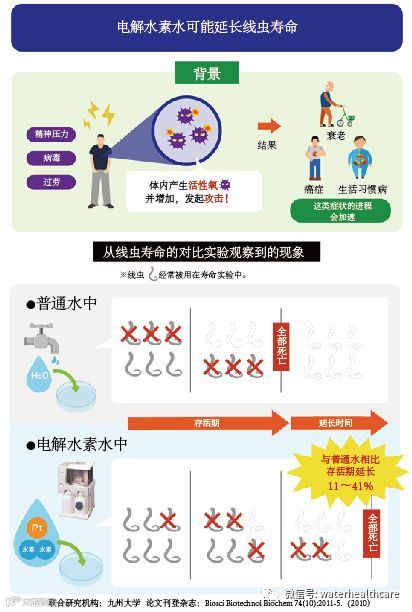 本研究为弄清楚电解还原水能给线虫(Caenorhabditis elegans)寿命带来怎样的效果,制作了被称为水培养基地的新培养基,线虫在水培养基中显示其寿命要比在传统S培养基中更短。但是结果显示,在ERW-水培养基中,线虫寿命显著要比在超纯水-水培养基中寿命更长(11%到41%)。在ERW-S培养基和超纯水-S培养基之间,线虫的寿命没有显著差异。由于ERW-水培养基减少了百草枯引起的线虫体内ROS的蓄积,因此暗示ERW-水培养基至少能通过消除一部分ROS来延长线虫的寿命。
