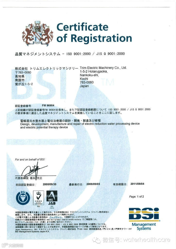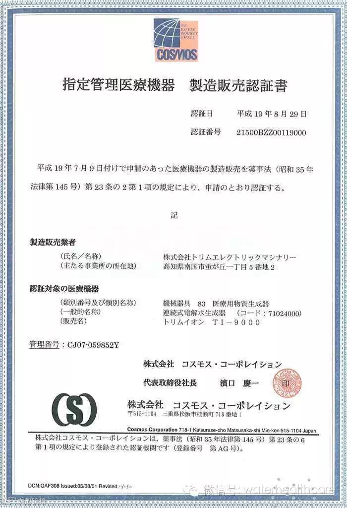 多宁电解还原水机产品的生产制造基地“株式会社多宁电子产品制造厂”取得ISO9001及ISO13485质量体系认证。