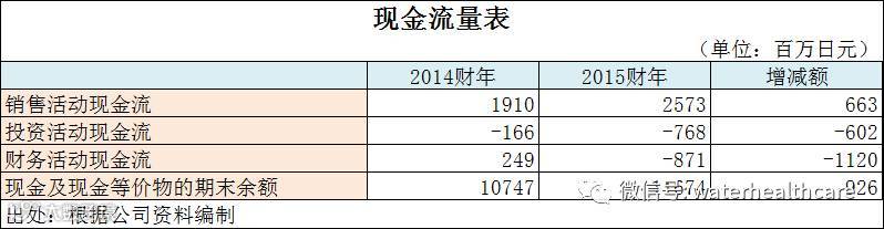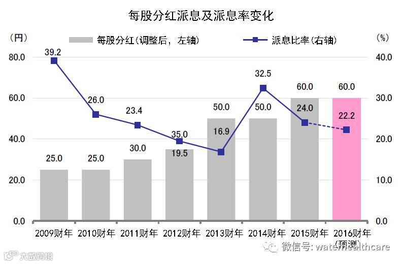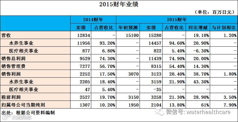 2015财年的营收同比增19.1%,实现15,280百万日元,营业利润同比增38.7%,实现3,123百万日元,税前利润同比增28.9%,完成3,258百万日元,归属母公司的当期纯利同比增61.0%,达到2,104百万日元。当年上半年创出过去最高的营收和业利润水平,下半年依旧保持强势,全年达成历史最高水平的营收和营业利润。业绩增长的火车头就是电解水素水整水器的旺销。