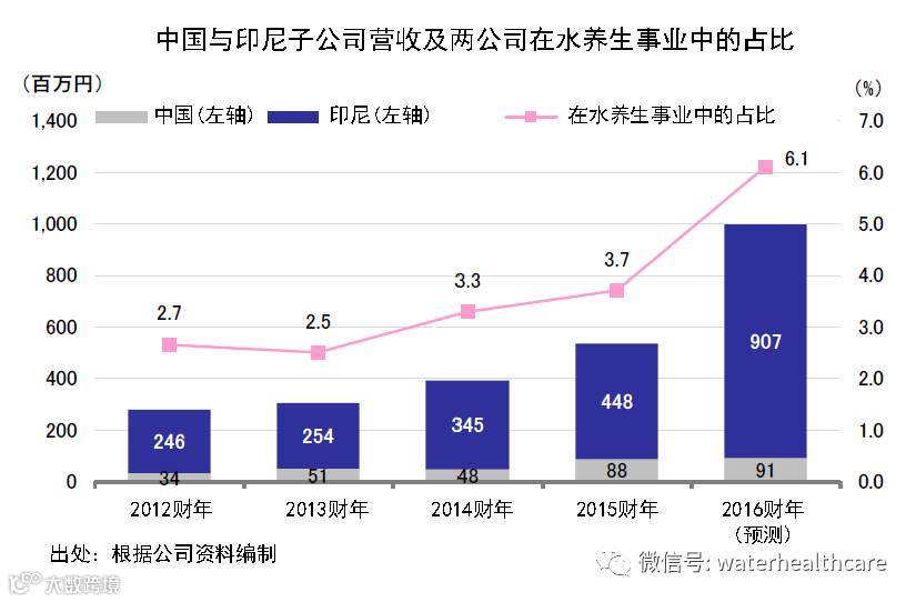 虽然在日本国内的家用电解水素水整水器市场占有压倒性的市场份额,但在亚洲市场目前采取的是开拓新市场的发展战略。目前已在中国、印尼、台湾、韩国设立了据点。2015财年实现的营收中国市场为88百万日元,印尼为448百万日元,水养生事业中这两家子公司占集团营收百分比为3.7%。