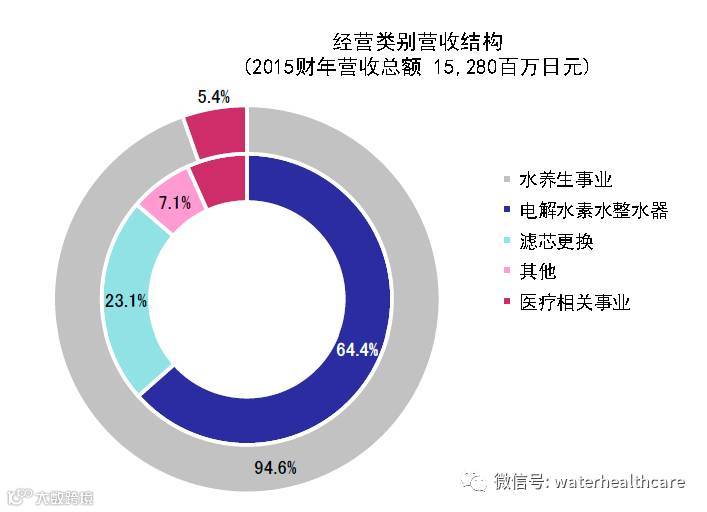 2015财年的营收(15,280百万日元)按事业类别划分如下:水养生事业94.6%(其中电解水素水整水器64.4%、滤芯23.1%、其他7.1%)、医疗相关事业5.4%。