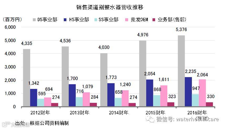 2015财年的整水器销售渠道别营收总额(9,834百万日元)中,自营的DS(直销)事业部实现4,976百万日元(占整水器总营收的50.6%),老顾客转介绍的HS事业部实现2,054百万日元(占比20.9%),百货店及运动俱乐部等现场促销活动模式的SS(店头销售)事业部实现868百万日元(占比8.8%),面向大型电器厂家等供货的批发与OEM实现1,611百万日元(占比16.4%),业务部(售后)实现323百万日元(占比3.3%)。