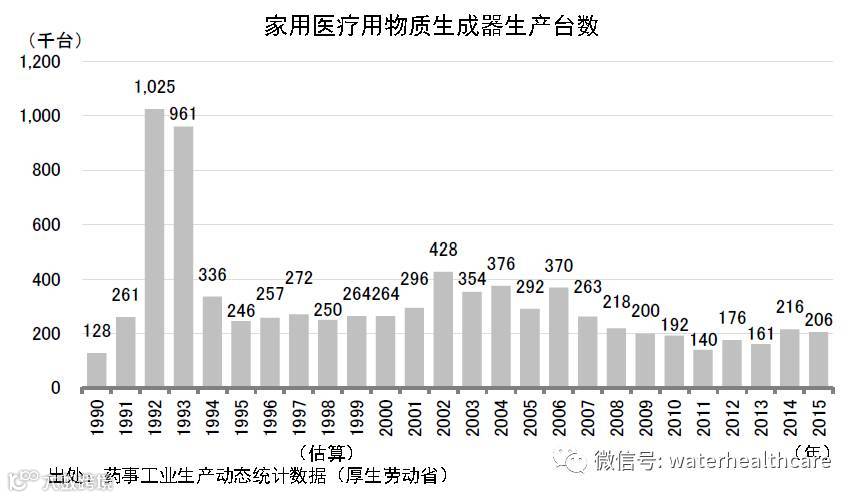 根据厚生劳动省药事工业生产动态统计数据,2015年家用医疗用物质生成器的年度生产台数为205,506台,同比上年微降4.9%。2014年的生产台数同比上年劲升34.1%。过去,1992年当时兴起过碱性离子水热,年度生产台数曾超过100万台。