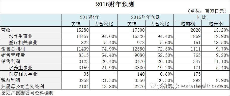 2016财年预计实现营收同比增加13.2%达到17,300百万日元,营业利润同比增加11.1%达到3,470百万日元,税前利润同比增加8.9%达到3,550百万日元,归属于母公司的当期纯利同比增7.8%达到2,270百万日元。2016财年由于营收和营业利润均创下历史最好水平,税前利润也因计入了汇兑收益(235百万円)而超越了总金额激增2013财年时的水平(3,442百万日元),预计收益水平会迎来新高。乘着水素水知名度的提高与市场的扩大这一东风,力求强化直销能力,整水器销售的持续增长指日可待。