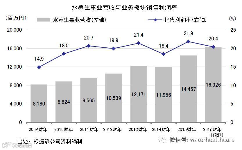 水养生事业的营收稳步增长,利润率保持在20%左右,收益性维持在高水平。