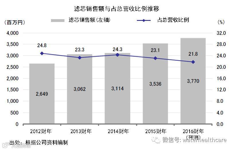 过滤芯根据使用情况通常每年要更换一次,随着在用整水器数量的增加,预期同样可以实现稳定的增长。2015财年的滤芯营收实现3,536百万日元,近3年保持了10.1%的年均增长率。与前述整水器营收之比基本保持在35%左右。此外,OEM定制售出的整水器的滤芯更换同样也是使用该公司的滤芯。针对第三方产销的“互换性”滤芯也采取了对策加以预防。将来在整水器普及台数达300万台、滤芯更换率达70%这一前提下,滤芯年销规模有望达到200亿日元。