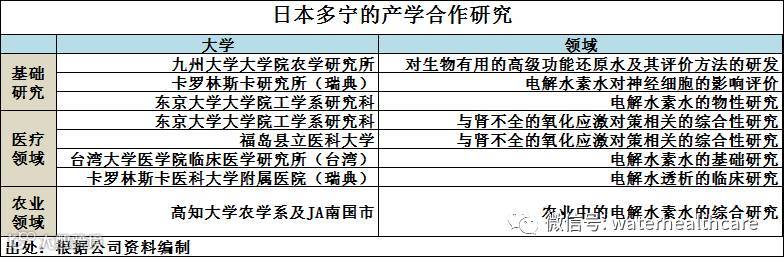 该公司早在1997年就发表了与九州大学大学院的合作研究论文《电解还原水具有清除活性氧及减轻DNA氧化损伤的作用》。现在,该公司正在联合开展基础研究工作的单位有九州大学大学院农学院、瑞典卡罗林斯卡研究所、东京大学大学院工学系研究科。医疗领域中的合作方有东北大学大学院研究科、福岛县立医科大学、台湾大学医学院临床医学研究所、卡罗林斯卡医科大学附属医院。农业领域中正与高知大学农业系、JA南国市、带广畜产大学开展着合作研究。