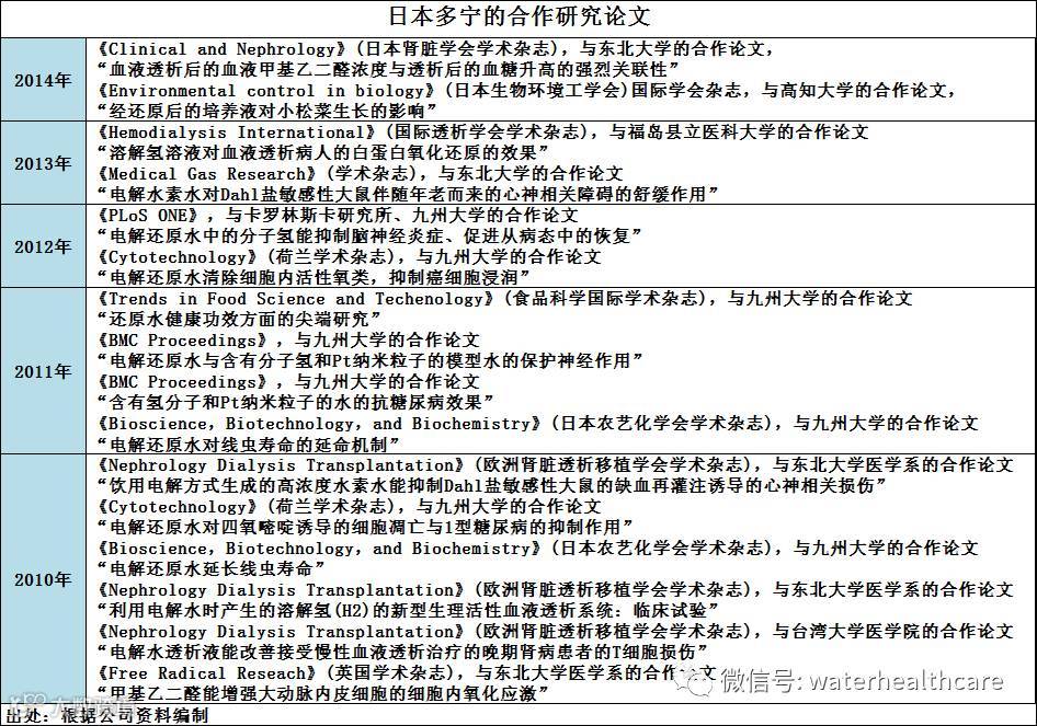 电解水素水(高级功能水)整水器头号厂家日本多宁<股票代码6788>已进入发展新台阶,正在积极发展各项业务。20多年来持续不断地狱国内外大学及科研机构联手进行合作研究,在科学依据的基础上,以科学手段把电解水素水的应用领域从饮用层面扩展至了医疗和农业领域。