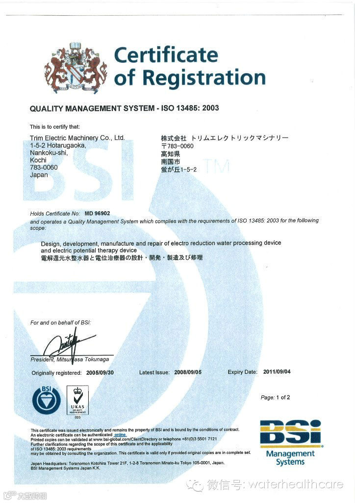 多宁电解还原水机产品的生产制造基地“株式会社多宁电子产品制造厂”取得ISO9001及ISO13485质量体系认证。