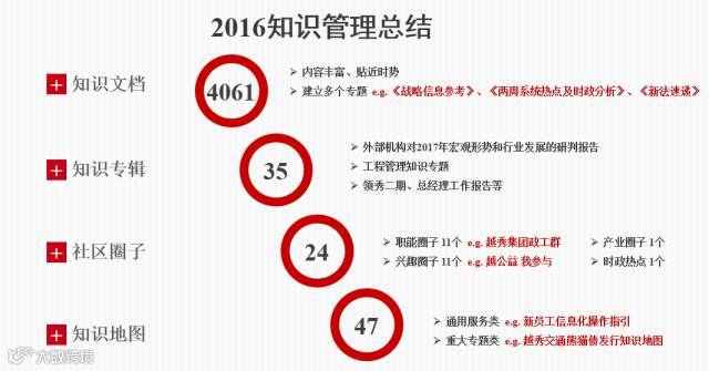2016年,越秀集团知识管理通过新系统的上线升级,新增和优化了社区话题、知识专辑、学习考试以及积分商城等模块,使知识管理界面更加清晰,同时推出了移动化应用微信企业号,使知识管理系统使用更加便捷。在清晰和便捷的新系统支撑下,越秀集团加大了宣贯和推广力度,吸引了越来越多的员工加入到知识管理中来,贡献了大量知识文档和信息。据统计,2016年集团知识管理共更新知识文档4061篇,创建知识专辑35个,建立社区圈子24个,制作知识地图47个。