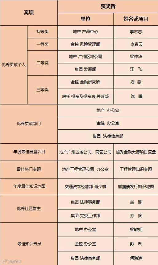 相比往年,越秀集团今年加大了对知识管理做出突出贡献的个人和团队进行嘉奖的力度和范围。此次活动颁发了优秀贡献个人奖、优秀贡献团队奖、最佳复盘项目等奖7项大奖,越秀地产产品中心李志忠等11名员工、越秀金控办公室等9个集体,以及《越秀金融大厦复盘》等2个项目和专题,获得了奖项和丰厚奖品。