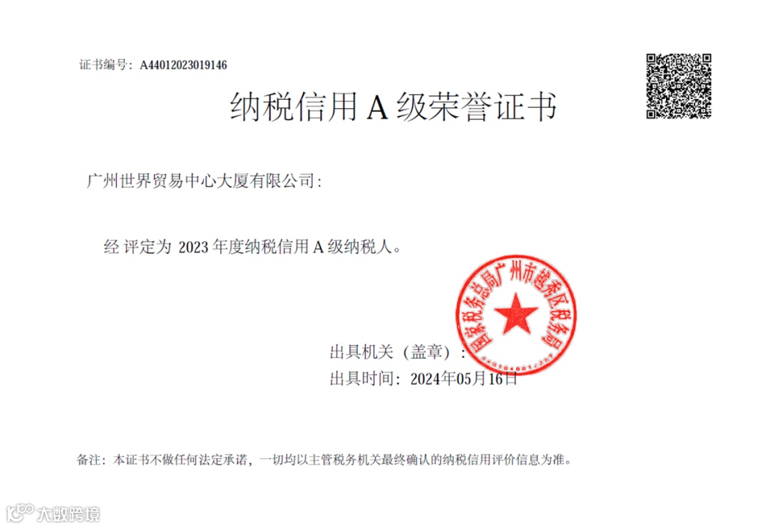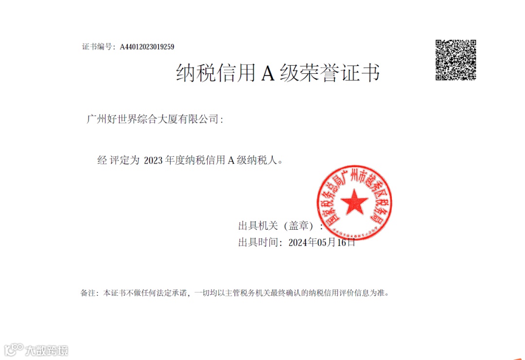 其中,广州世界贸易中心大厦有限公司、广州好世界综合大厦有限公司两家公司连续九年以上荣获A级纳税人;广州市江汇物业经营管理有限公司、广州市江沛物业发展有限公司两家公司首获A级纳税人殊荣。