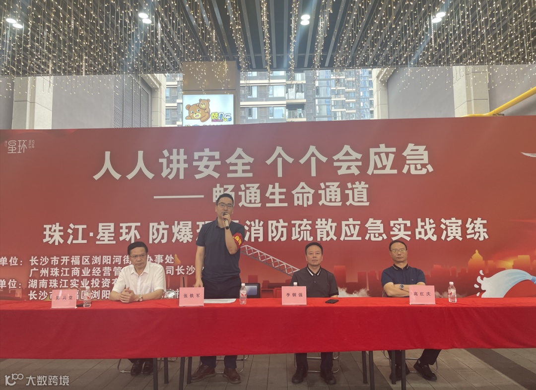 珠江·星环开展消防疏散应急实战活动,长沙市开福区浏阳河街道办事处工会副书记办事处主任李铜强,湖南珠江实业投资有限公司总工程师高红庆,广州珠江商业管理有限公司长沙分公司总经理张铁军,广州珠江城市管理服务集团股份有限公司湖南分公司副总经理陈兵堂出席活动。