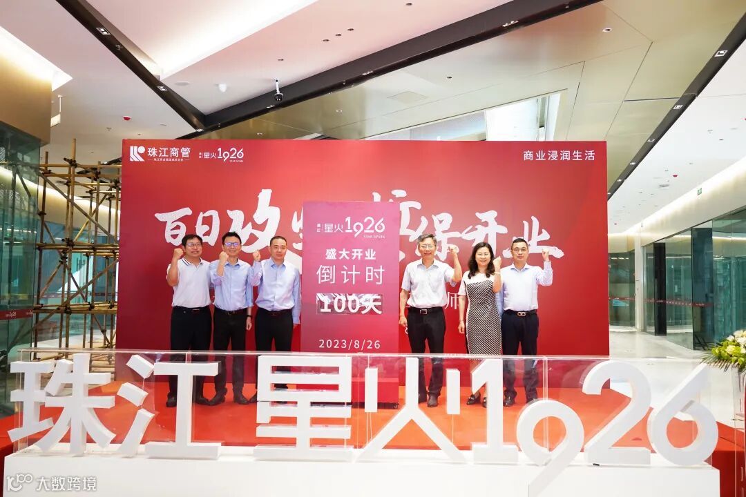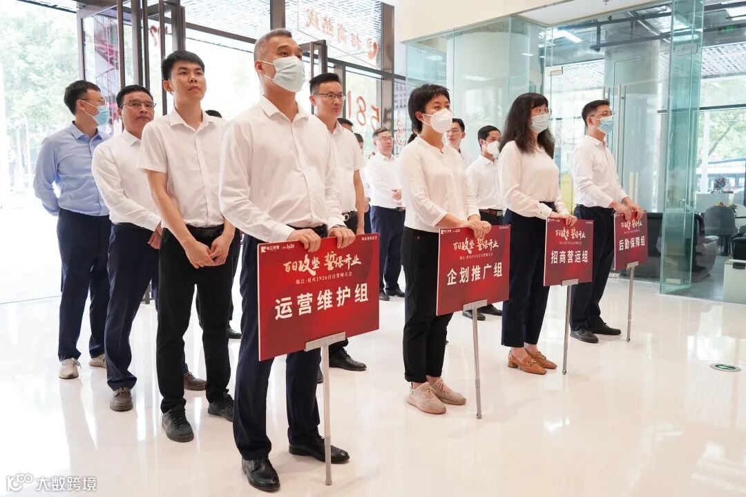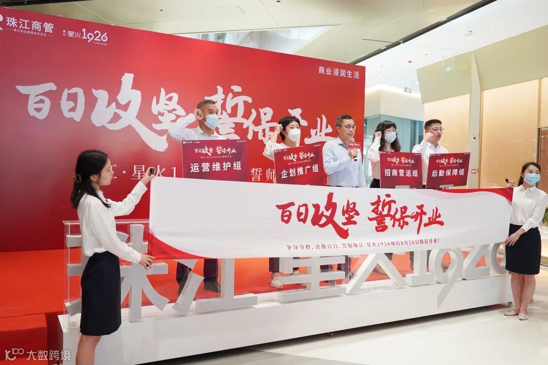 珠江商管领导为项目开业百日倒计时牌揭幕,正式吹响了珠江·星火1926开业的冲刺号角。随后,在场全体人员在项目负责人的带领下共同作百日攻坚宣誓。