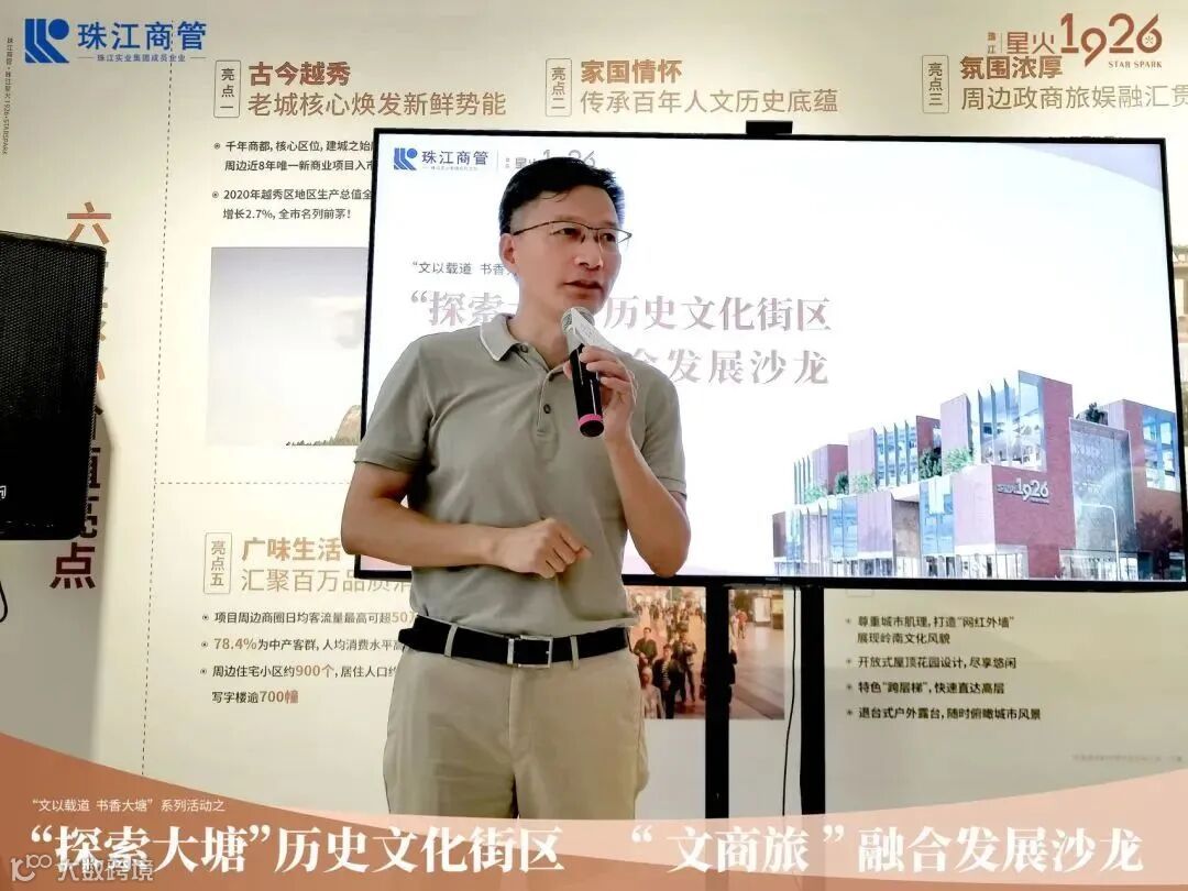随后,珠江商管党总支书记、董事长王友华分享其在文化领域的心路历程,同时提出现阶段传统商业面临着存量饱和、电商冲击等重重挑战,因此要更加注重在与“文”、“旅”融合下寻求破局之路,实现新突破、新发展。珠江商管党总支委员、副总经理陈杰忠提出珠江·星火1926将根植于大塘街的历史文脉,探索“文商旅” 商业新模式,为商业破局注入“文”、“旅”软实力。
