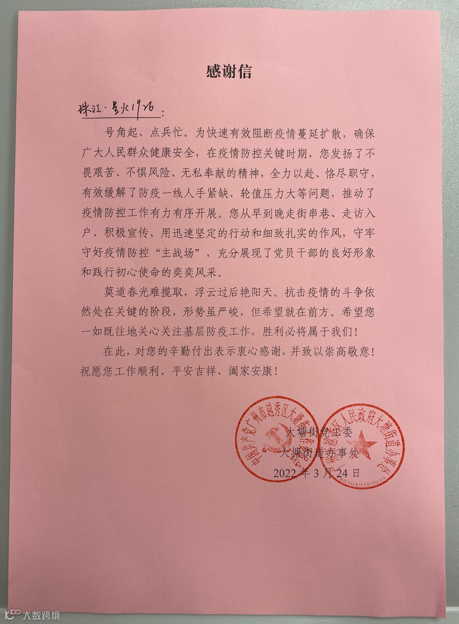 2022年3月29日,珠江•星火1926项目收到来自越秀区大塘街党工委、大塘街道办事处的感谢信,信中对珠江商管珠江•星火1926项目在疫情关键时期积极响应国家号召,关注片区疫情防控所做出的贡献给予高度的肯定和由衷的感谢!