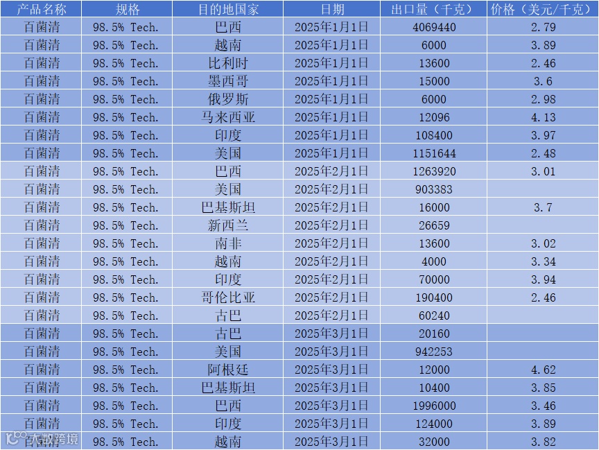 出口数据|百菌清 98% Tech. 出口节奏全景:巴西放量领跑,印度价格一路上扬