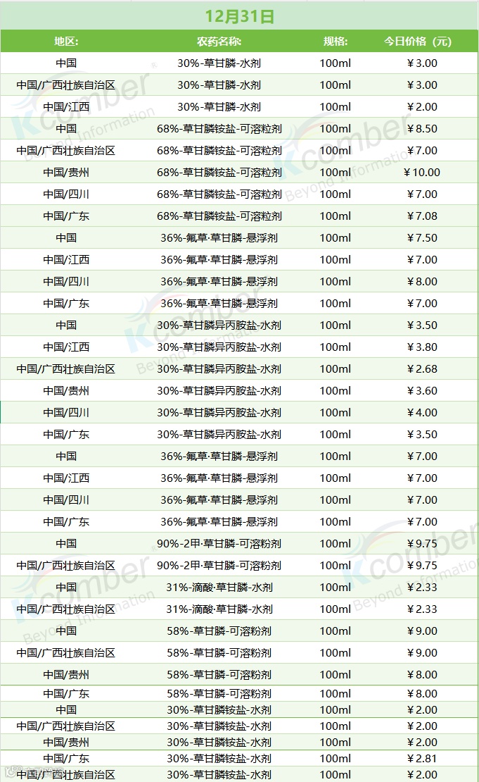 📅 12月31日草甘膦及复配制剂主要市场零售价(100ml)