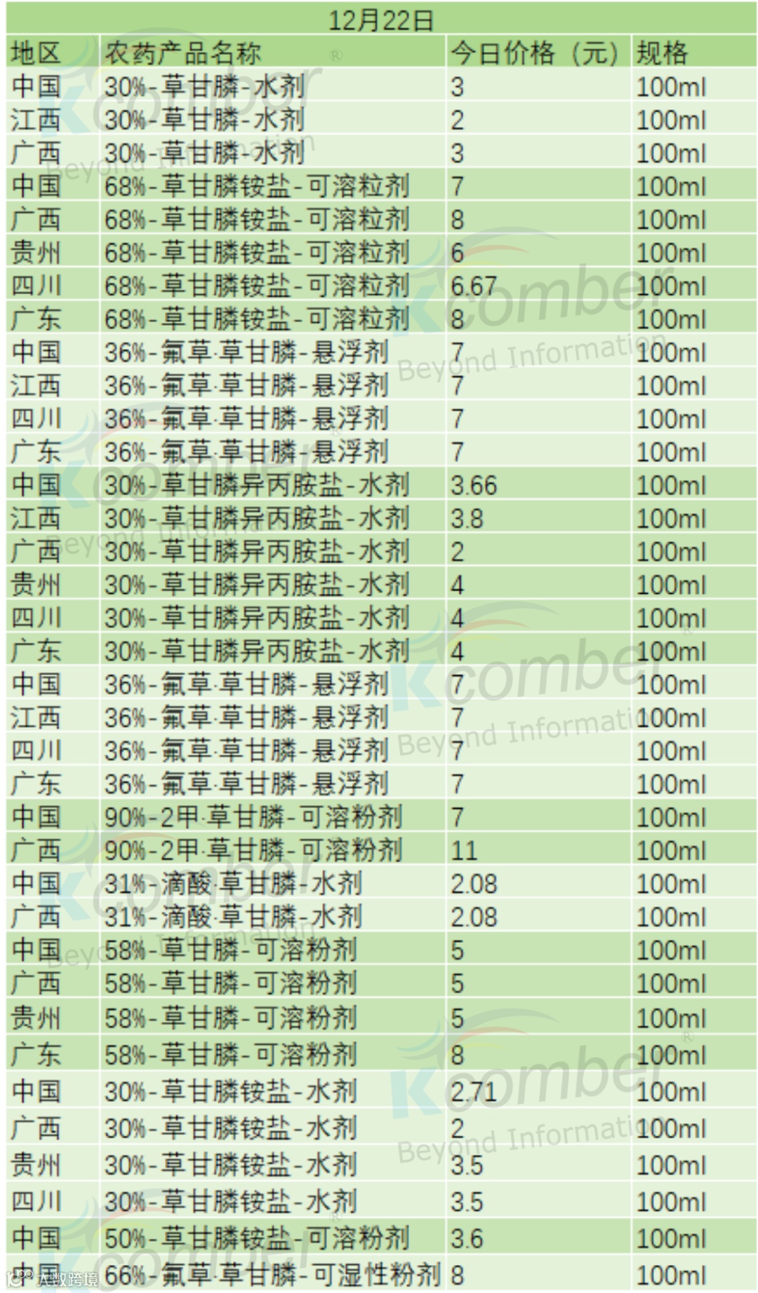 📅 12 月 22 日草甘膦类农药零售价(100ml 规格)
