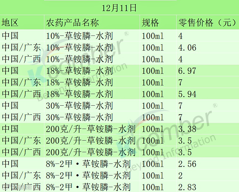 📅 12月11日草铵膦类农药零售价(100ml 规格)