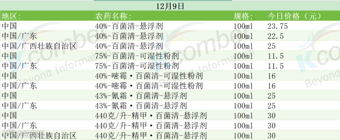 📅 12月9日百菌清及复配制剂主要市场零售价(100ml)