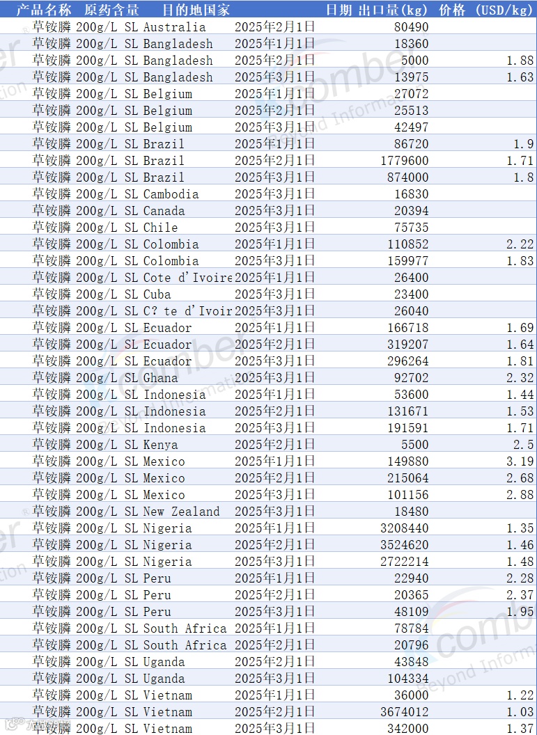 进入 2025 年一季度,草铵膦 200g/L SL 出口节奏明显加快。1–3 月间,多国订单集中释放,尼日利亚、越南等市场单月出口量快速放大,价格则在低位区间内小幅波动,呈现“量先行、价分化”的阶段特征。