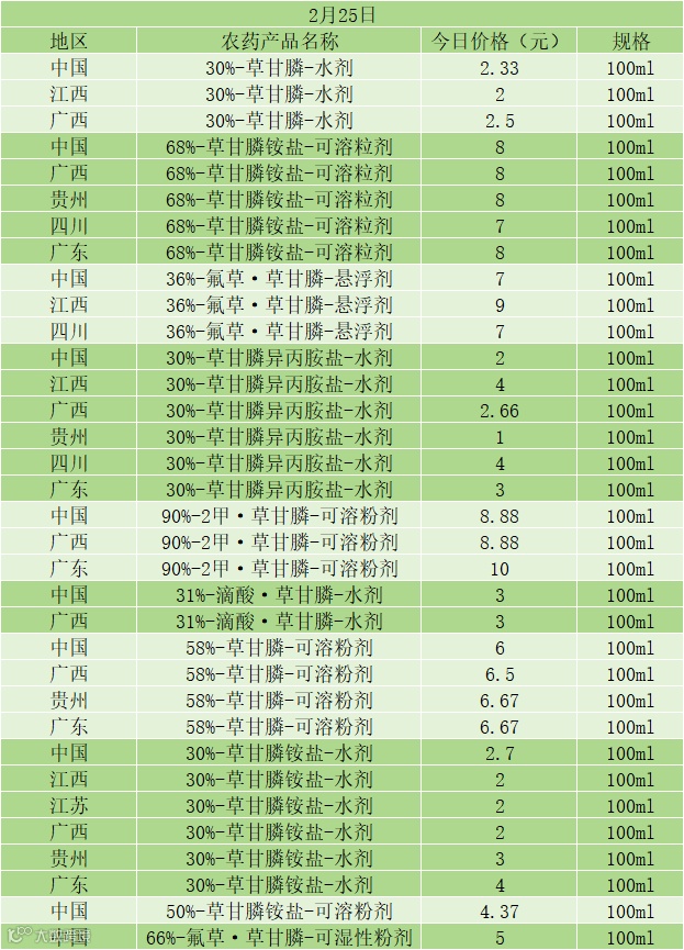 📅 2 月 25 日草甘膦类农药零售价(100ml 规格)