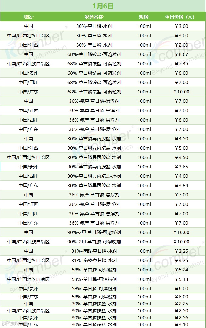 📅 1 月 6 日草甘膦类农药零售价(100ml 规格)与前几日相比