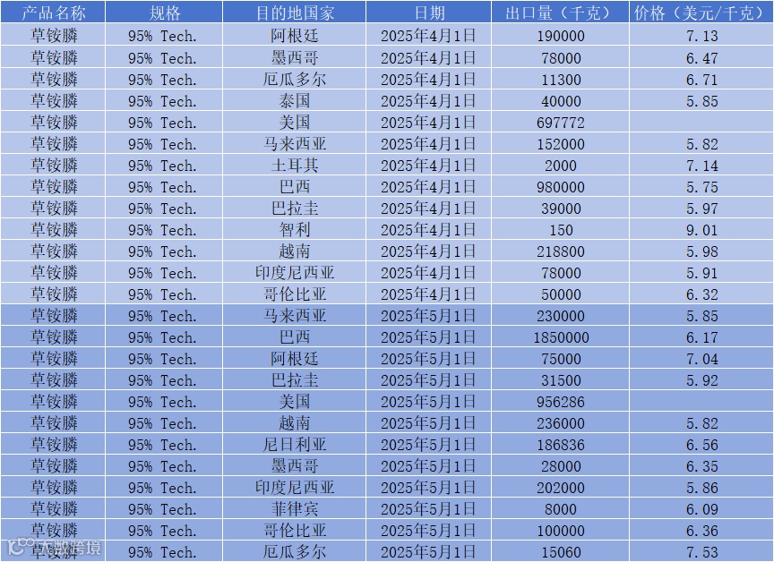 作为全球非选择性除草剂的核心原药品种,草铵膦 95% Tech. 的出口走势直接反映了全球农业生产对高效除草剂的需求结构。2025 年 4-5 月,随着南美与北美种植旺季同步启动,该原药品种呈现出 “美巴双核心主导、高端市场溢价显著” 的特征。本文依托真实出口交易数据,完整还原草铵膦 95% Tech. 的全球出口量价表现与区域格局,为行业从业者提供精准参考。