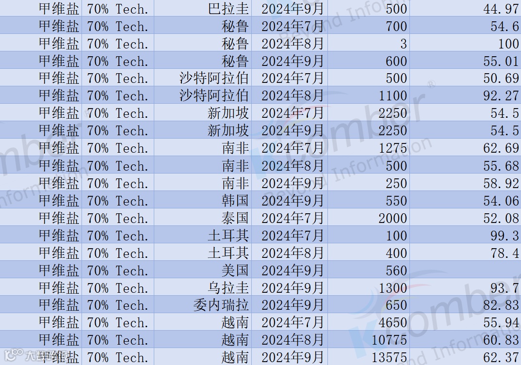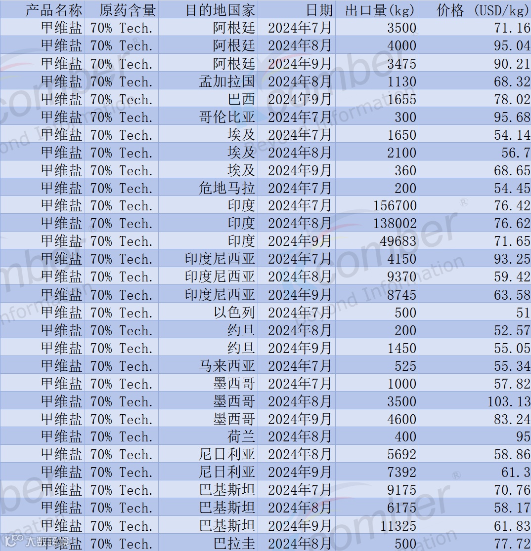 整体特征:甲维盐原药出口呈现“一主多辅”的格局:印度支撑前两月总量,9 月回落明显;价格由 8 月短期冲高后在 9 月趋于收敛;各区域维持小批量刚需采购。